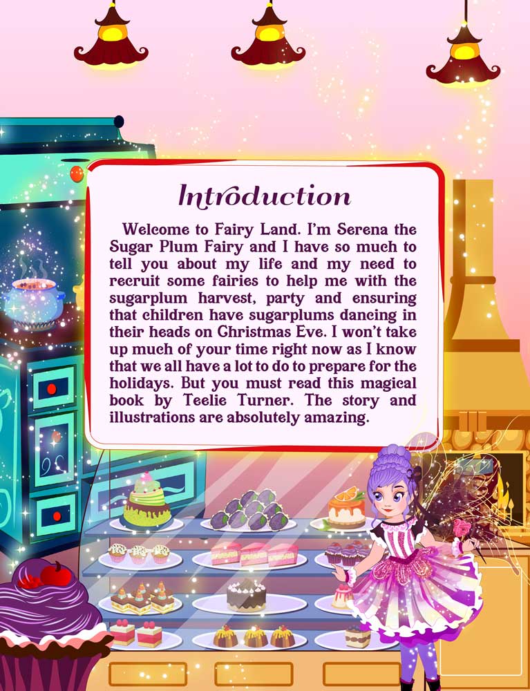 Welcome to Fairy Land. I'm Serena the Sugar Plum Fairy and I have so much to tell you about my life and my need to figure out a way to ensure there are enough fairies to help me with the sugarplum harvest, party, and ensure that children have sugarplums dancing in their heads on Christmas Eve. I won't take up much of your time right now as I know that we all have a lot to do to prepare for the holidays. But you must read this magical book by Teelie Turner. The story and illustrations are absolutely amazing.