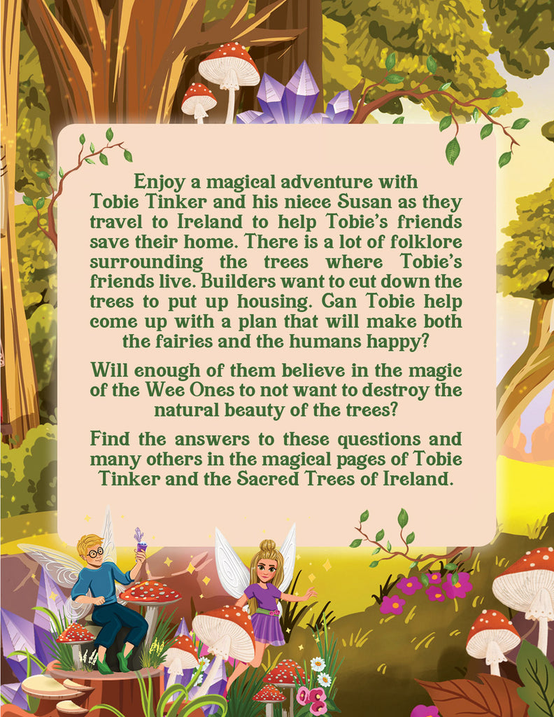 Join me on an amazing trip to Ireland. My niece Susan will be joining me as we visit my friends Devin and Maureen. They need my help to save their homes from the destruction of some builders who want to destroy the magic of the trees that they live in. While in Ireland, I’ll also visit some of its amazing sights and do my best to help my friends. Ireland is a long way from Fairy Land but with a little magic, I can easily travel anywhere in the world. Read all about it in Teelie Turner’s amazing tale Tobie Tinker and the Sacred Trees of Ireland.
