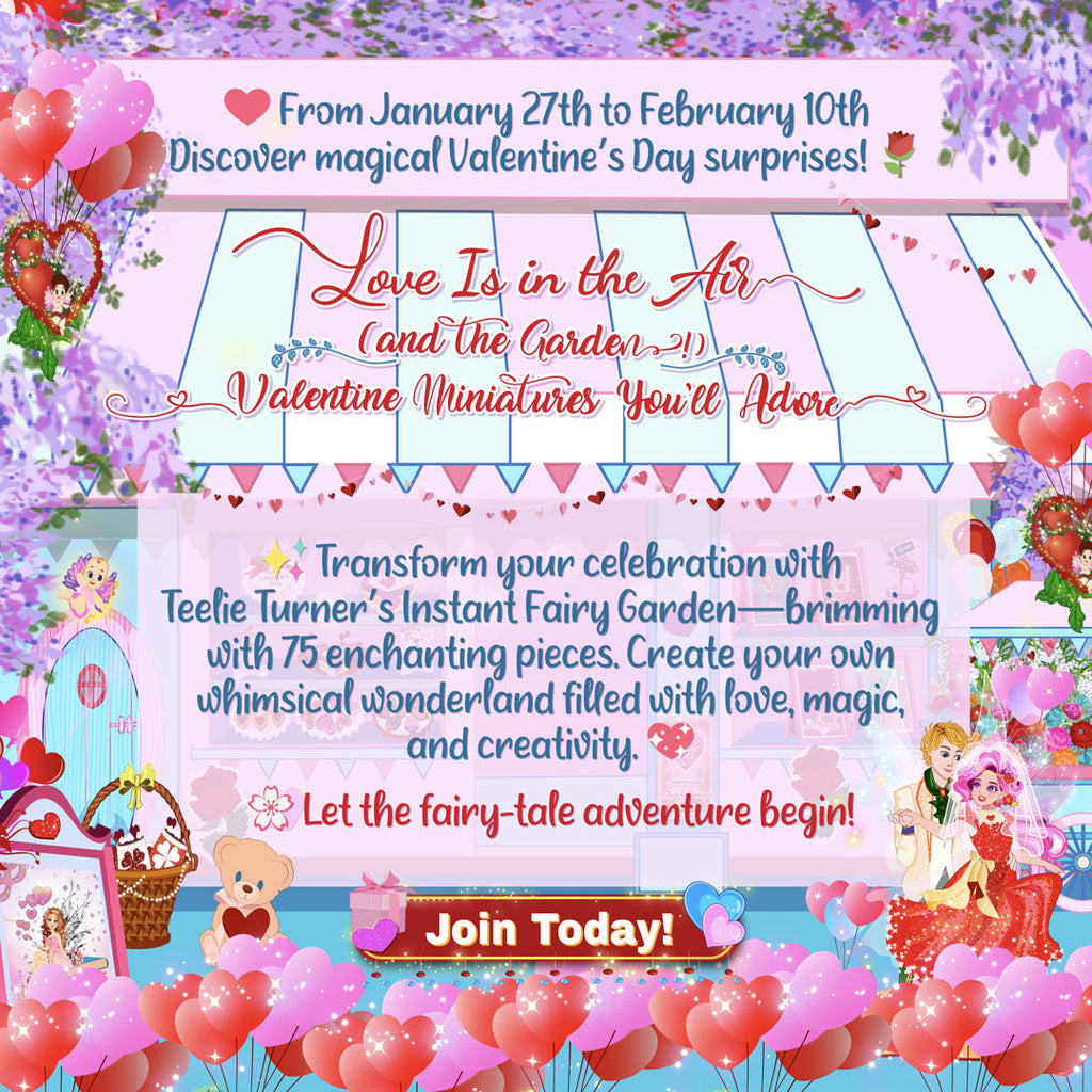 Fairy lovers rejoice! Valentine's Day is here and it's the most magical day of all for your special fairy friends. Let Teelie Turner help you make the day extra special with her exclusive Valentine's Day Digital Instant Fairy Garden. She has hand-crafted miniature fairies and items to add to adorable fairy gardens, dollhouses, or even create magical scenes inside a terrarium! Show your love for fairies this Valentines Day with these delightful accents that will make your magical world absolutely sparkle! Make sure your favorite little winged-ones receive the royal treatment this February 14th and get your Valentine's Digital Instant Fairy Garden today!