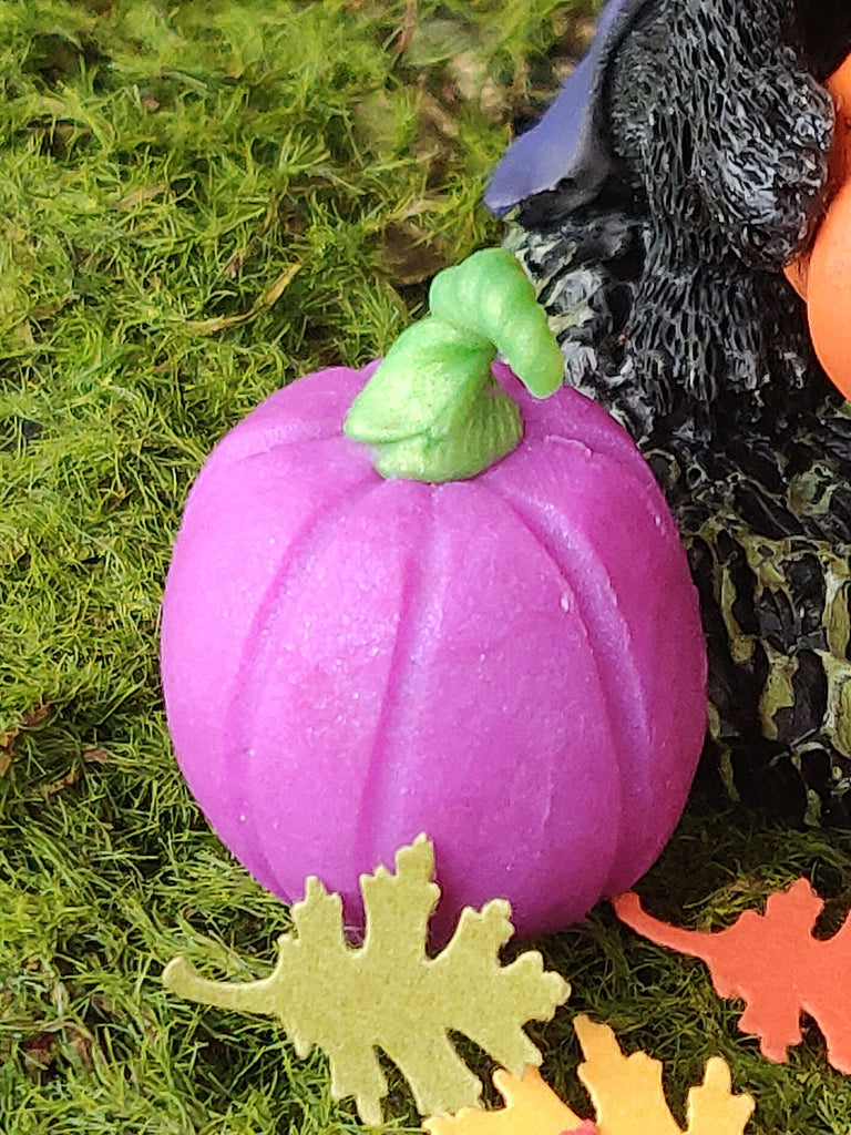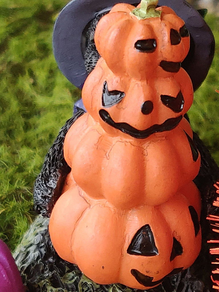 * 1 cute black cat with a lavender cape and hat holding a stack of orange Halloween pumpkins-standing on a mound of grass