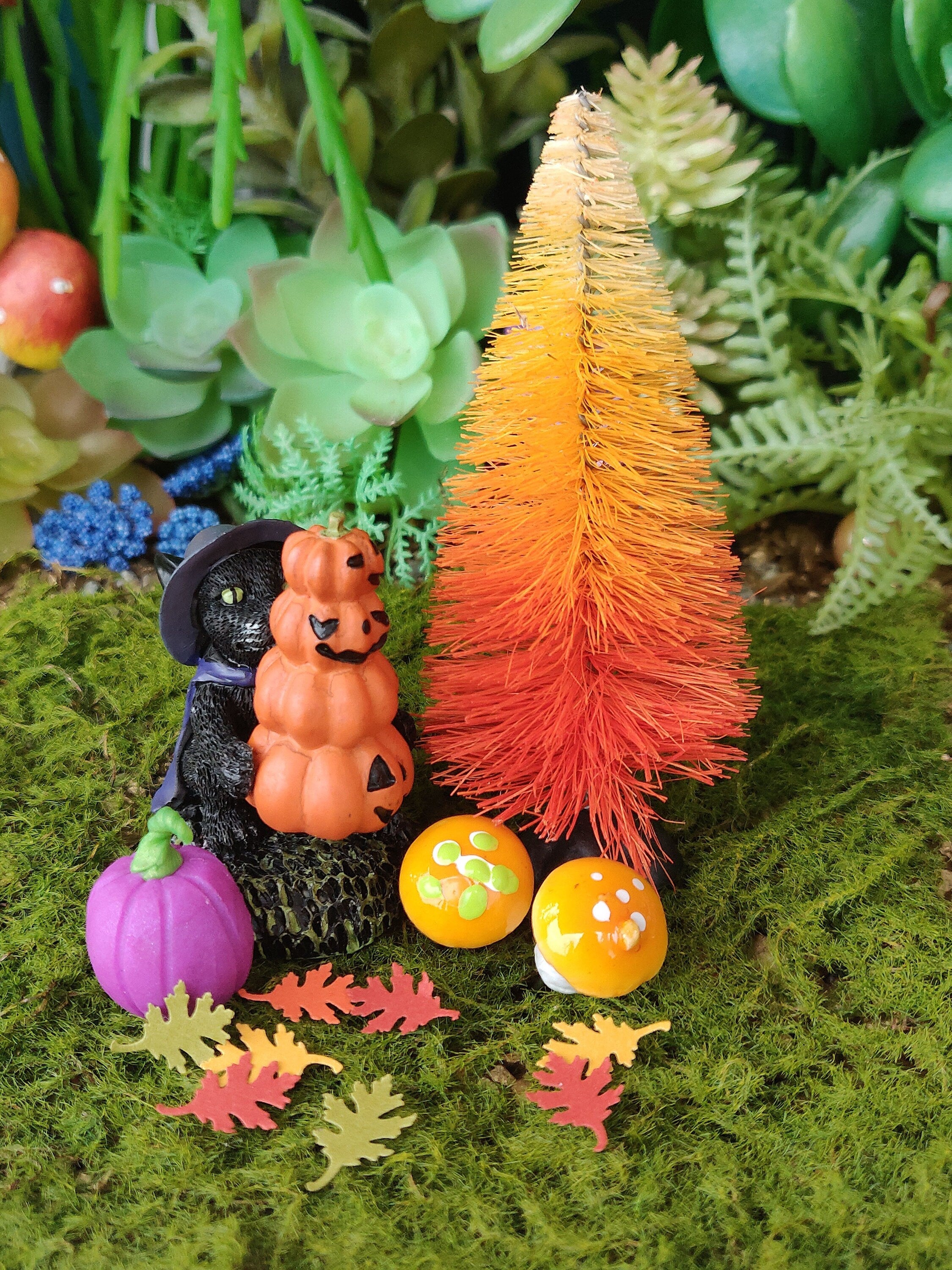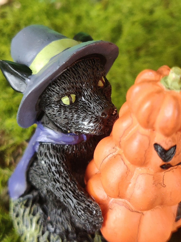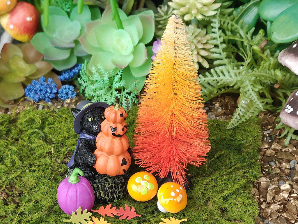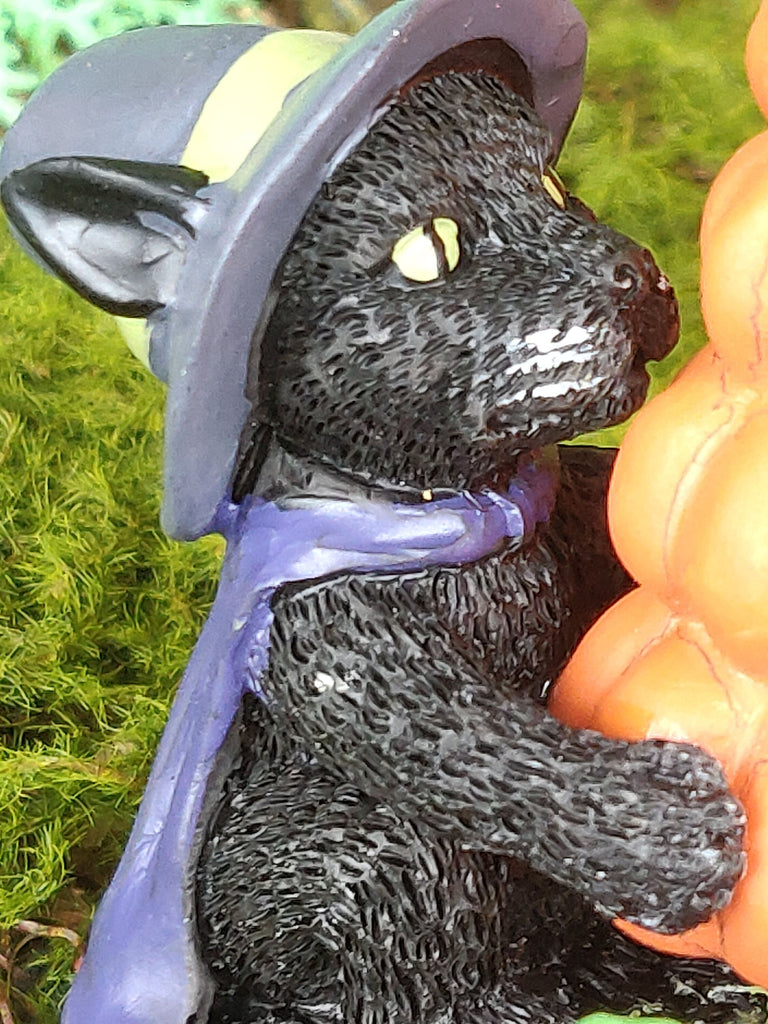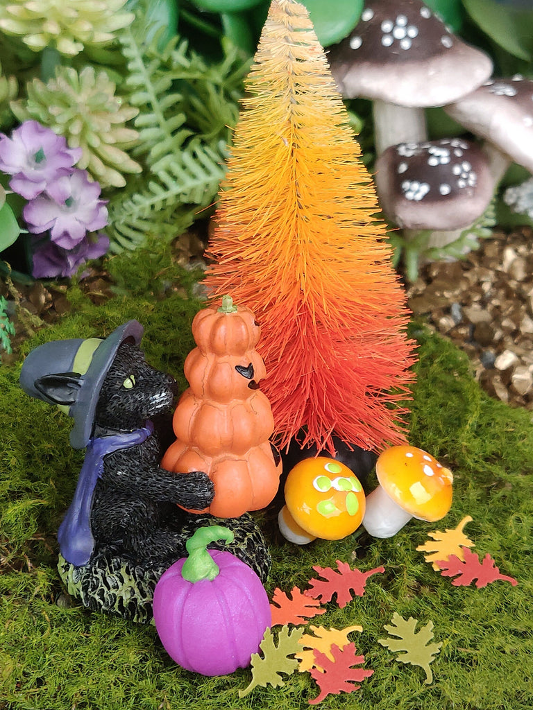This kooky little kitty is all dressed up and ready to get spooky! Adorable and detailed, this Halloween Black Cat with Lavender Cape is the perfect scare-tacular addition to your miniature, dollhouse or fairy garden. Includes a Halloween tree and mushrooms - jack o' lanterns not included. Meow-velous!