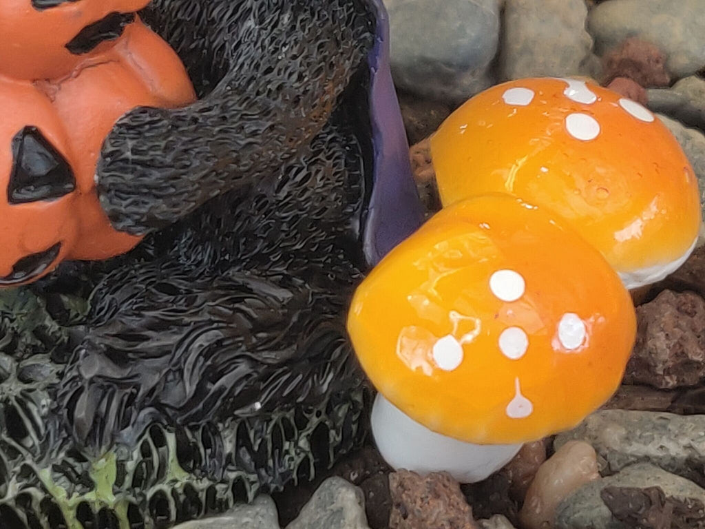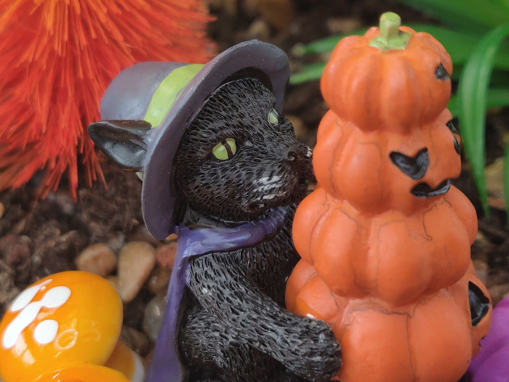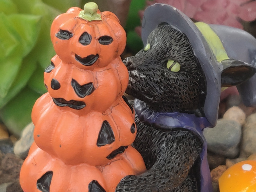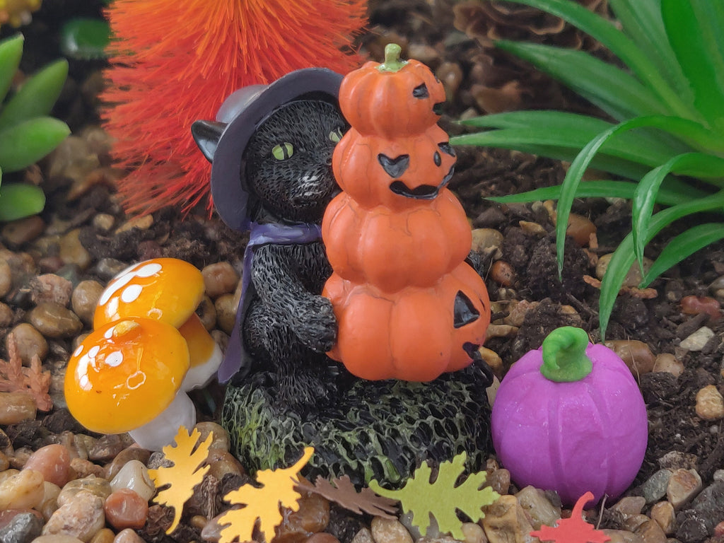 This Black Cat wearing a hat with a stack of orange pumpkins and mushroom is super excited to bring home his new harvest of gourds – giving your fairy garden, dollhouse, or miniature a touch of seasonal flair! Keepin' it real with a hint of spooky!