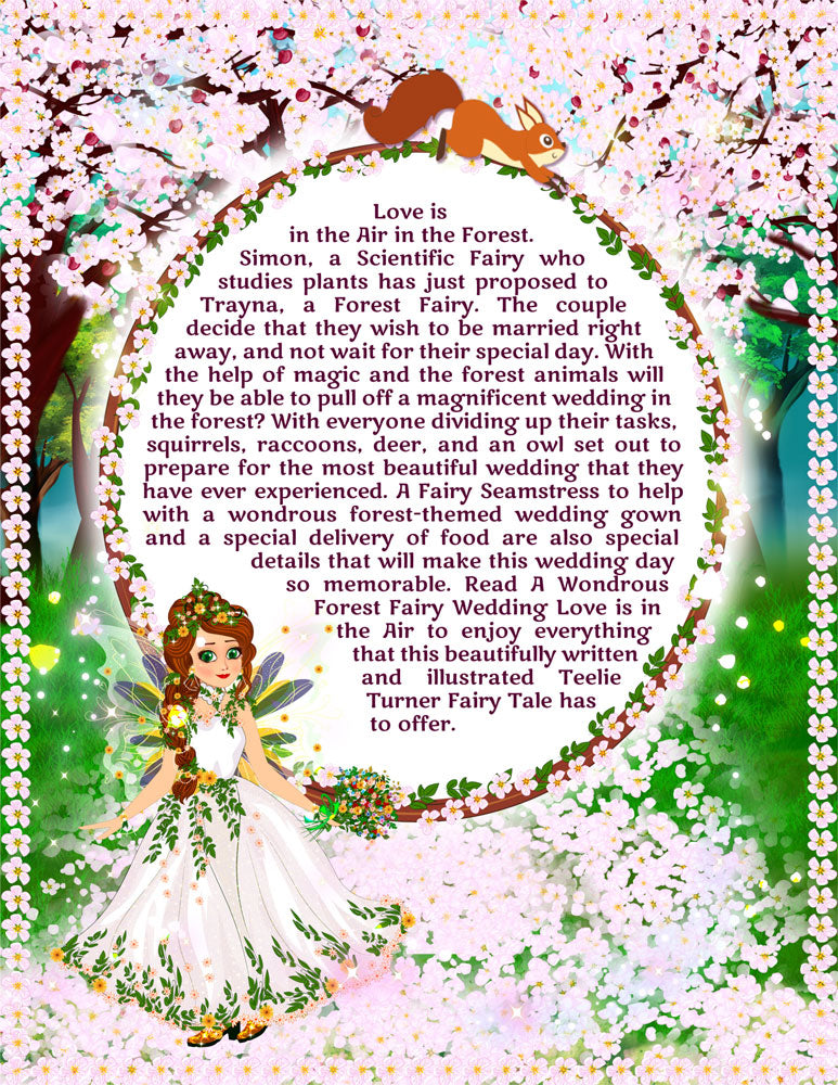 Welcome to the forest, come on in and join us on this wondrous day. Love is in the air in the forest. You've probably noticed that all the animals are a little busier than normal flying, running and jumping around. That's because it is an amazing day. Trayna a Forest Fairy who has been looking after the animals for the past five years is about to marry Simon, a Scientific Fairy who studies plants. They have decided not to wait to hold their wedding and want to have the ceremony today in the forest. All of the animals are pitching in to divide up the tasks to make it an exquisite day. Fairy magic is also a must to make some details fall into place. Read this magical Teelie Turner story to join in on the wedding day fun.