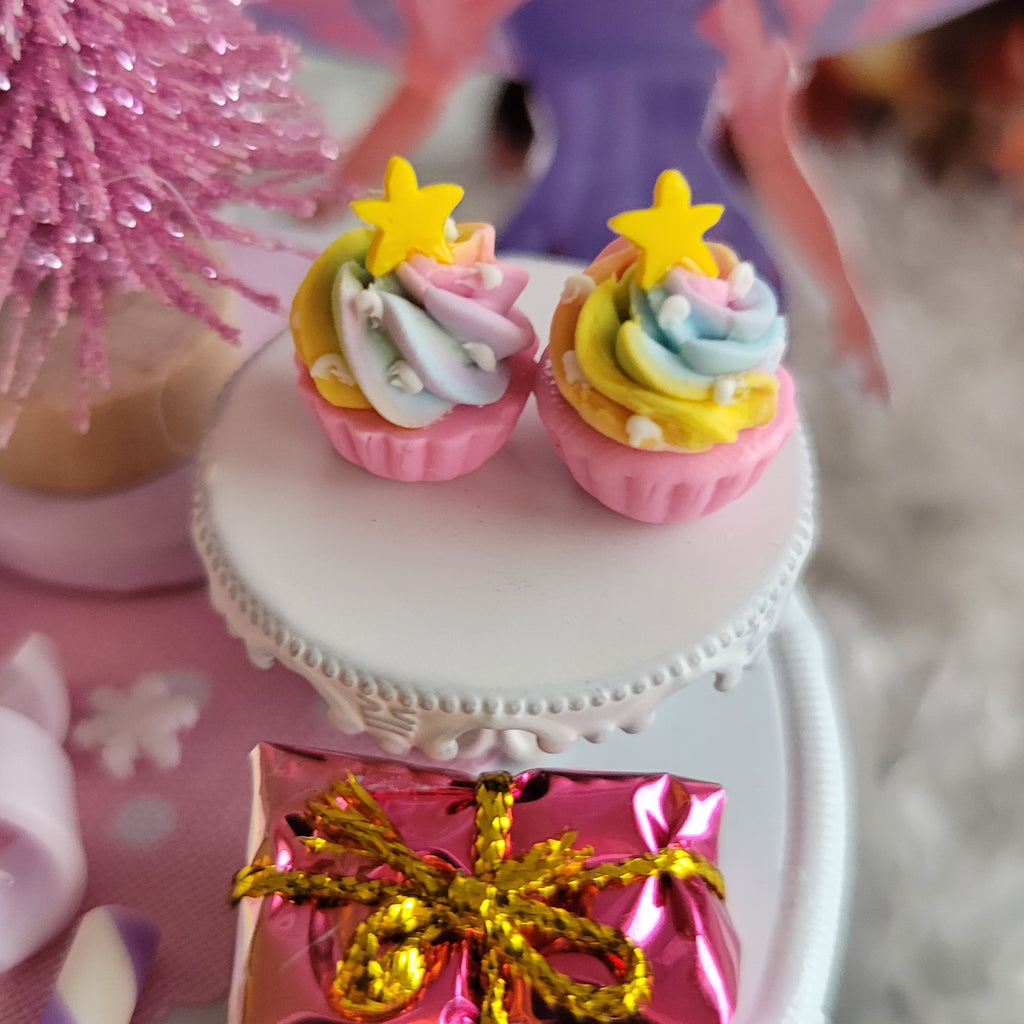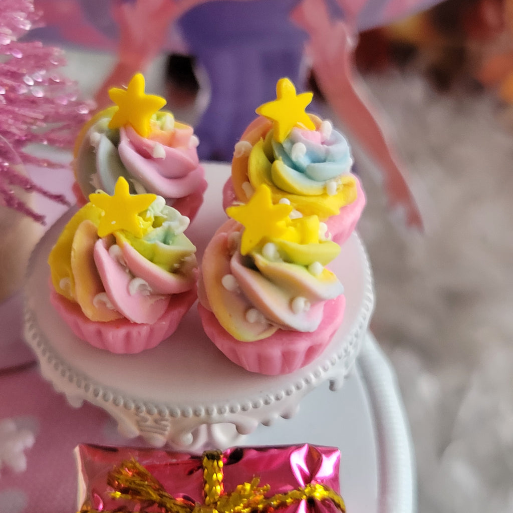Pastel Cupcakes: Adorable tiny cupcakes with pastel frosting and topped with bright yellow stars, perfect for fairy-sized celebrations. 1:12
