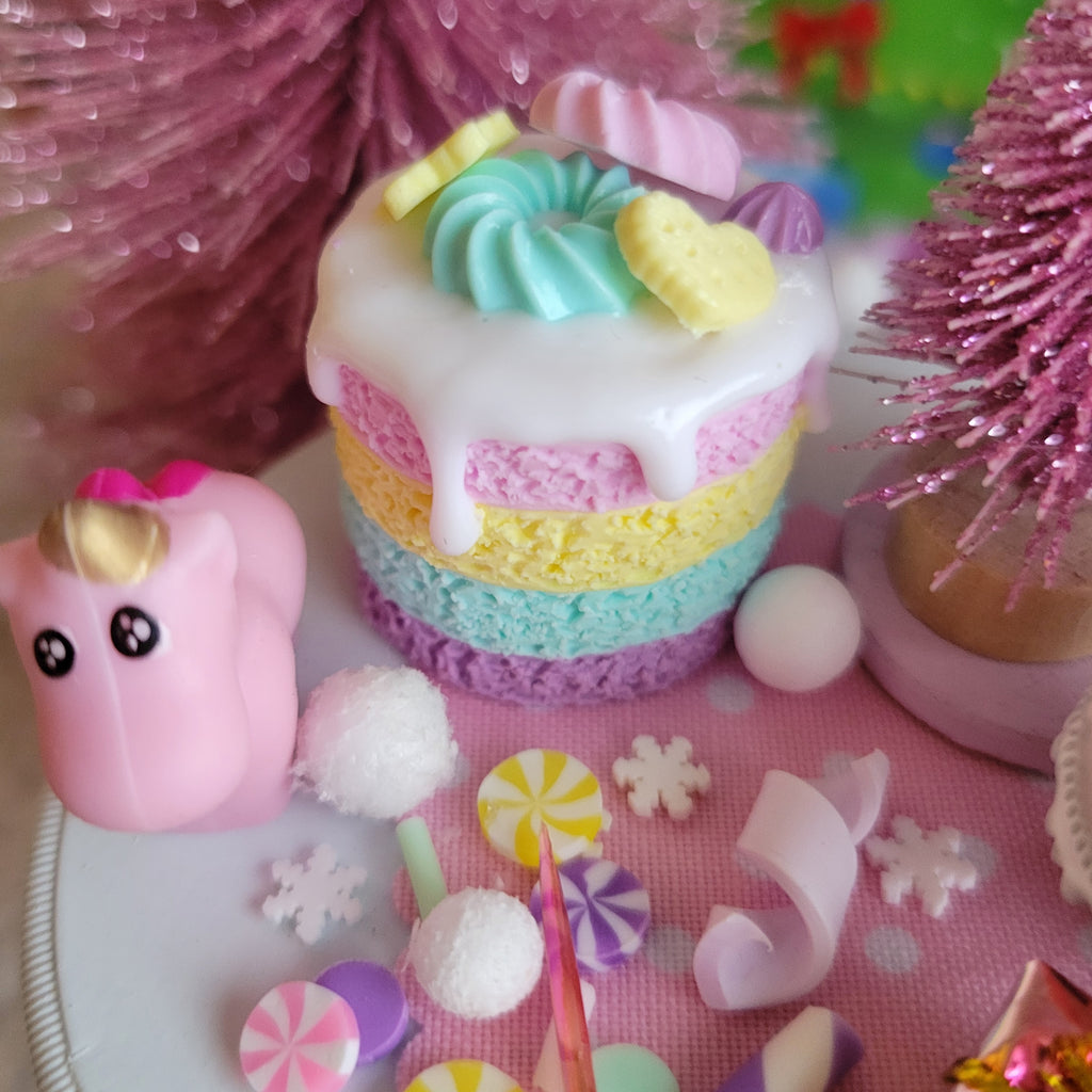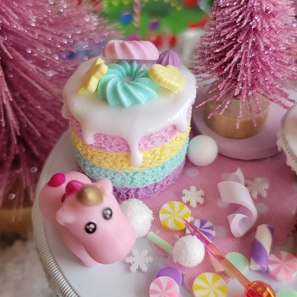 Pastel Layered Cake: A delightful miniature cake with soft pastel layers, topped with tiny pastel cookies and dripping vanilla frosting, making it the centerpiece of this fairyland. 1:6