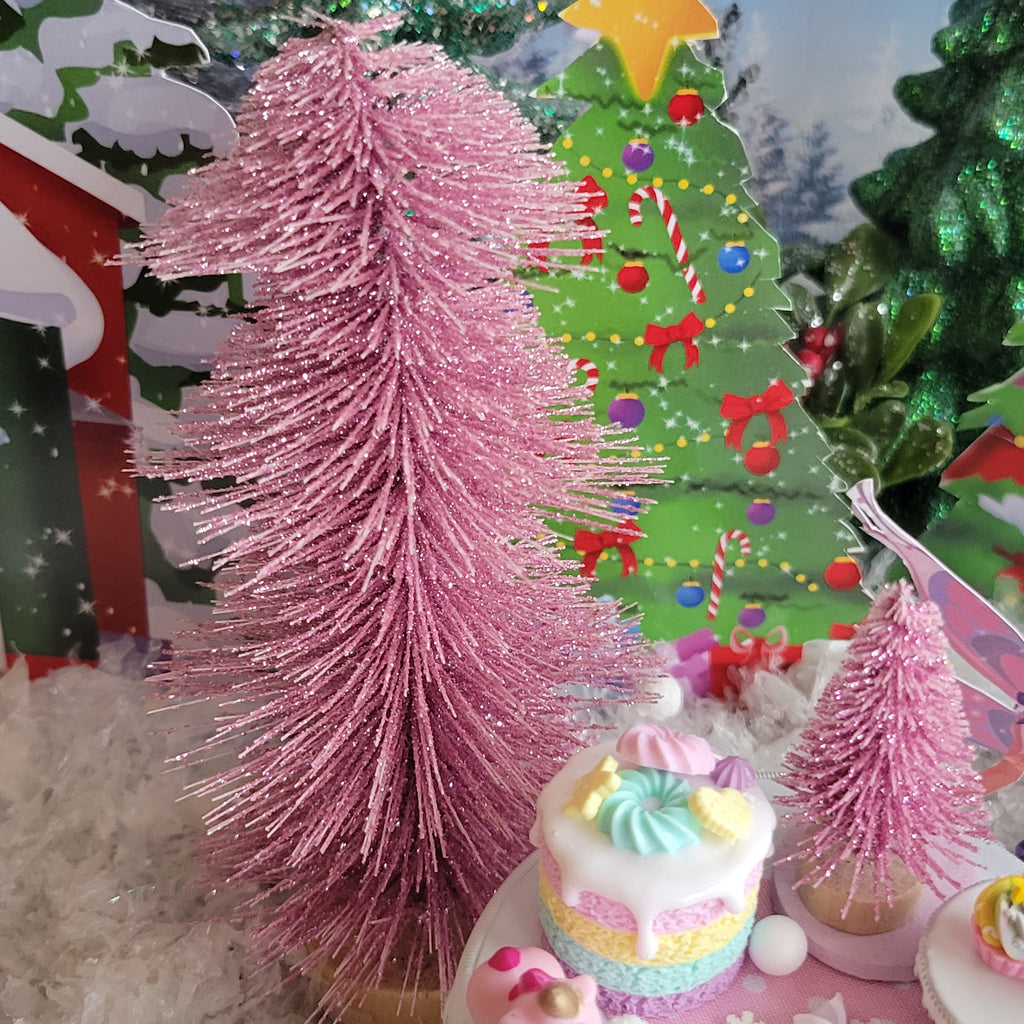 Pink Christmas Trees: Small and large pink trees dusted with sparkling detail, creating a dreamy, wintry forest. Small 2" Large 51/2" tall X 23/4" wide