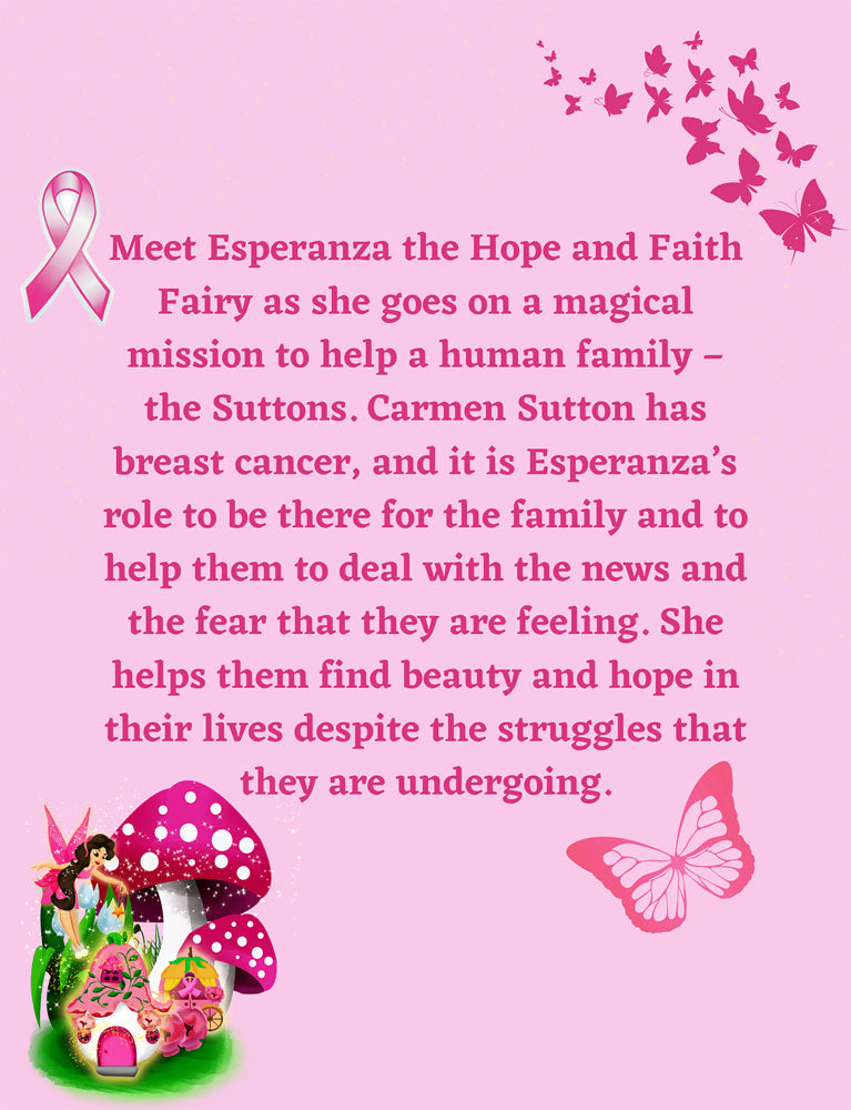 The Wee Folk in the Magical Kingdom know how serious the subject of breast cancer is, and they wanted to create a magical story that could help bring hope and faith to anyone who is battling this illness. That is why they created Esperanza the Hope and Faith Fairy. In the following pages, you’ll get to meet her and the Sutton Family. If you or someone you know is battling this illness, know that our thoughts and prayers are with you. We hope that you enjoy this story and that it can make your struggle a little bit easier by enjoying the beauty surrounded by Esperanza’s actions despite everything that the Sutton Family is going through. A percentage of the sale of each book will go towards breast cancer research in hopes that someday breast cancer can be a thing of the past.