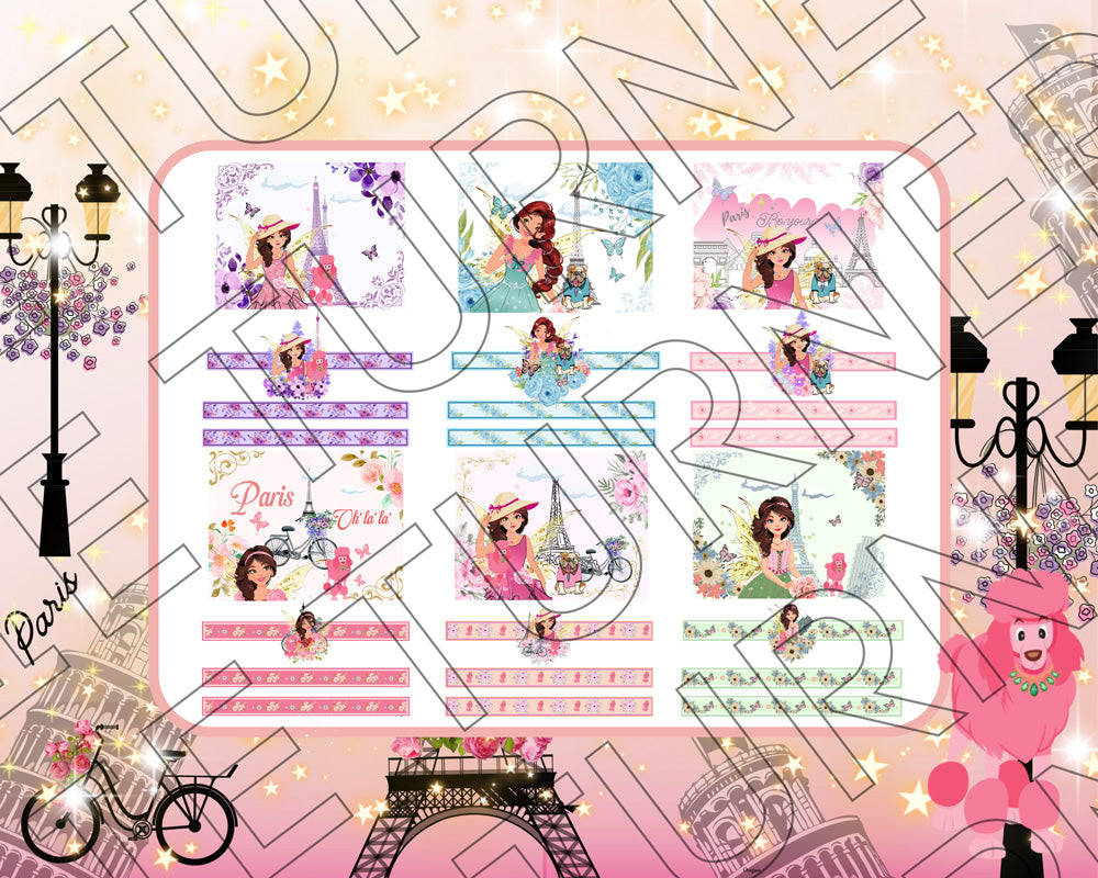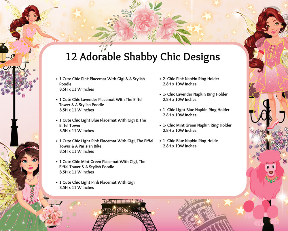 In this adorable digital download, you’ll receive six fairy placemats and six napkin ring holders. They’ll be great for family celebrations, sleepovers, birthday parties or a fairy themed supper. Gigi the Chic Magical Fairy can be found on all these enchanted designs.