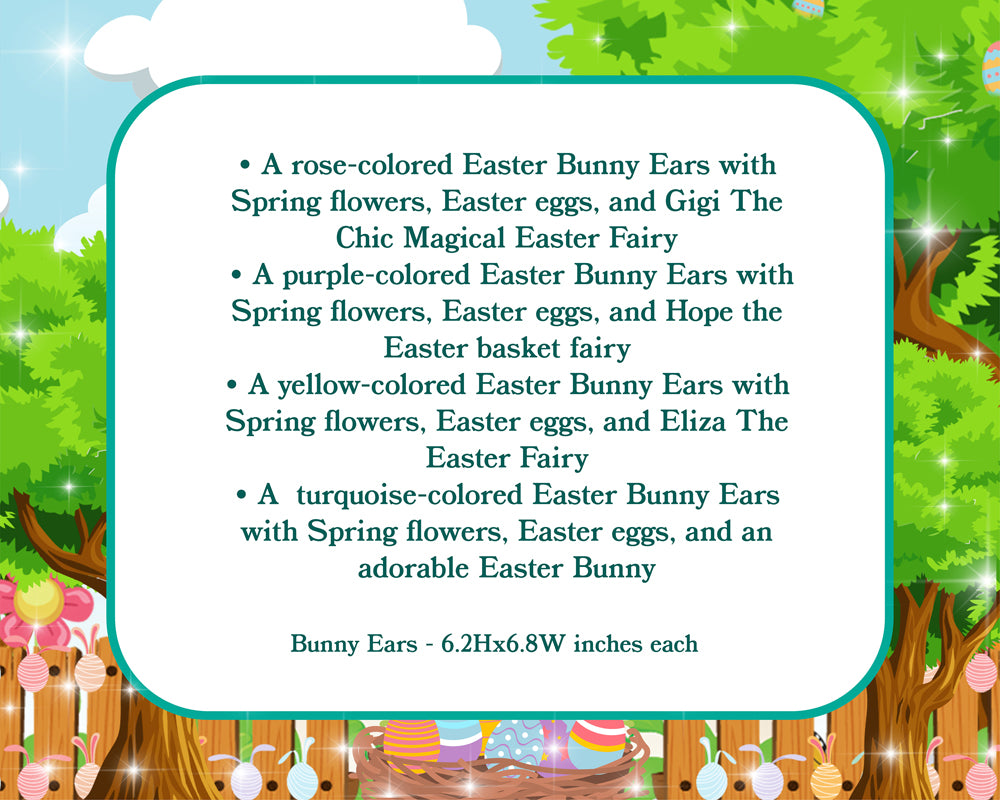A yellow-colored Easter Bunny Ears with Spring flowers, Easter eggs, and Eliza The Easter Fairy