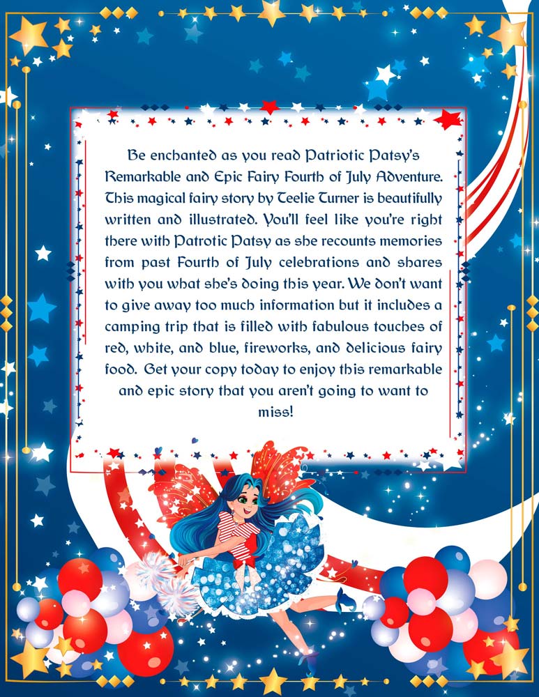 Be enchanted as you read Patriotic Patsy's Remarkable and Epic Fairy Fourth of July Adventure. This magical fairy story by Teelie Turner is beautifully written and illustrated. You'll feel like you're right there with Patriotic Patsy as she recounts memories from past Fourth of July celebrations and shares with you what she's doing this year. We don't want to give away too much information but it includes a camping trip that is filled with fabulous touches of red, white, and blue, fireworks, and delicious fairy food. Get your copy today to enjoy this remarkable and epic story that you aren't going to want to miss!