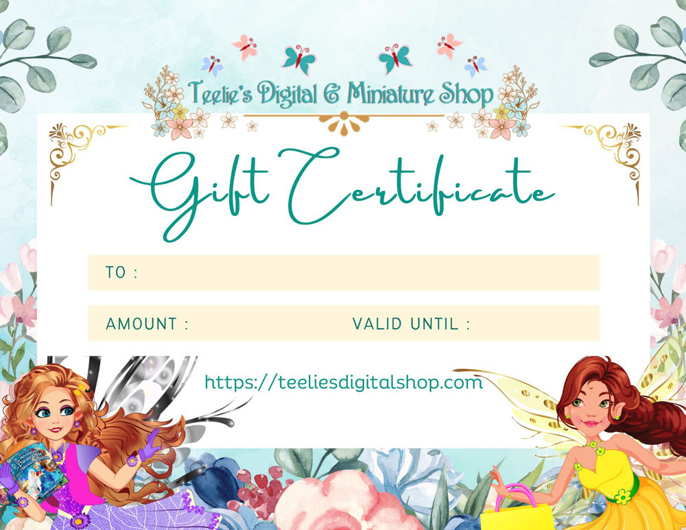 Are you looking for a unique way to show someone special how much you care? Look no further than the gift certificates from Teelie's Digital and Miniature Shop! Our gift certificates come in all sizes, making them perfect for any occasion. From birthdays to holidays, special occasions, or just because - our gift certificates are sure to light up the eyes of any fairy-lover.