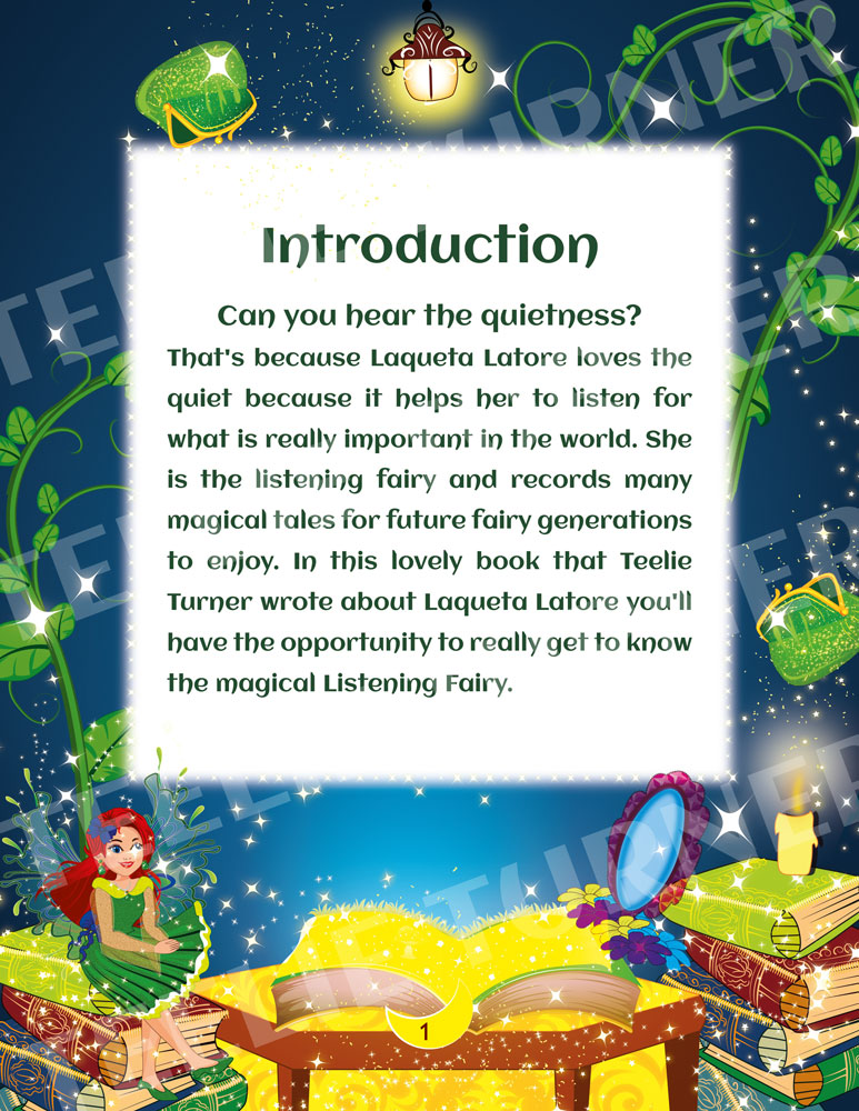 Laqueta Latore loves the quiet because it helps her to listen to what is really important in the world. She is the listening fairy and records many magical tales for future fairy generations to enjoy. In this lovely book that Teelie Turner wrote about Laqueta Latore you'll have the opportunity to really get to know the magical Listening Fairy. This is your amazing magical eBook for you to love and enjoy! You'll be entranced by Laqueta's story and amazed by her magic as she teaches us all the importance of listening. This is a must-have eBook for anyone who loves fairies, magic, and a good story!